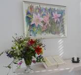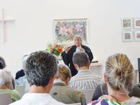 Pfarrer Klaus bezog sich in seiner Ansprache auf das Lilien-Aquarell über dem Altar mit den Worten Jesu: „Sehet die Lilien auf dem Felde..“